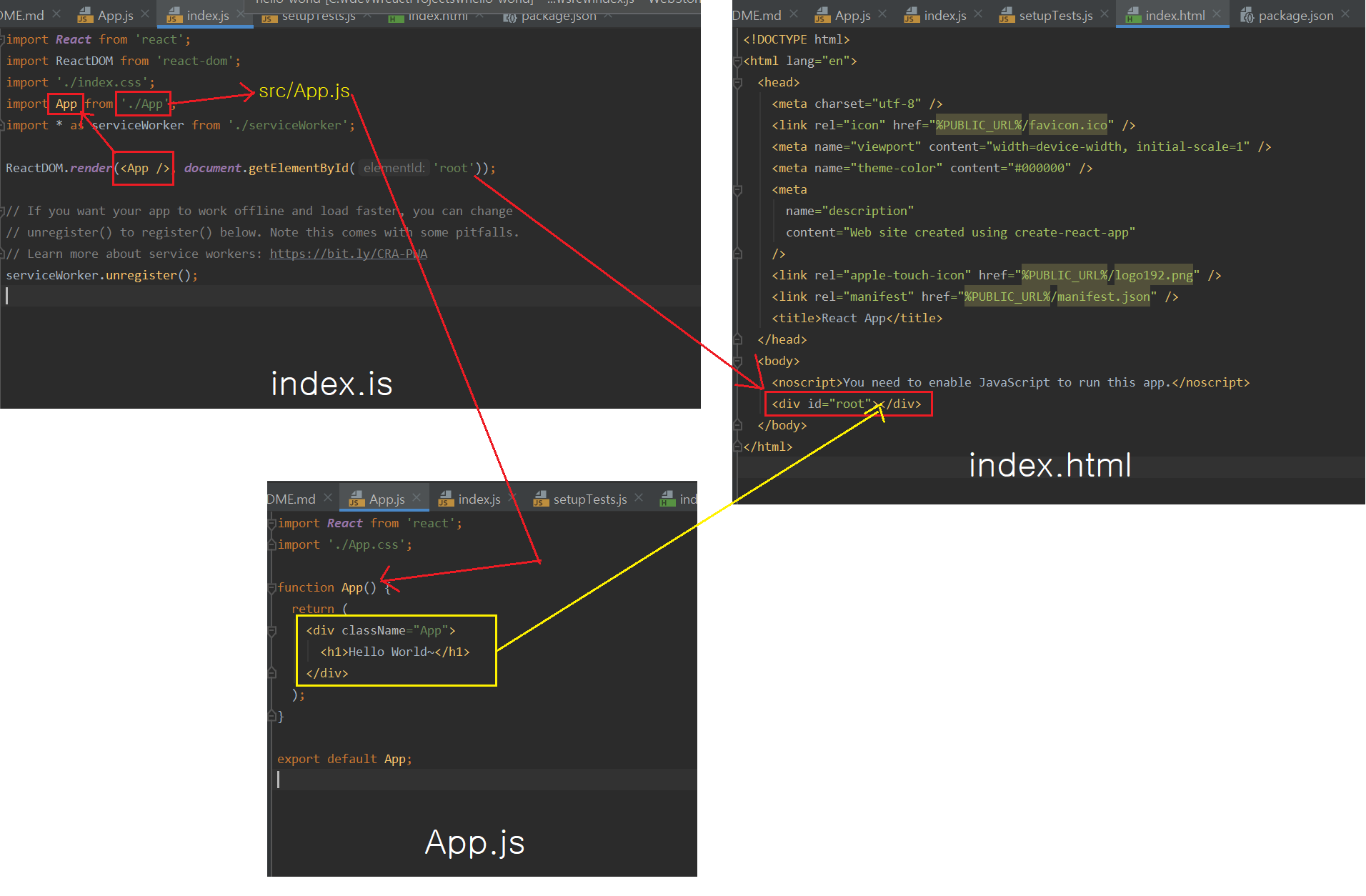 root 라는 id 를 가진 element 를 찾고 거기에 Tag 명이 App 인것을 inner html로 넣기로 되어있습니다.