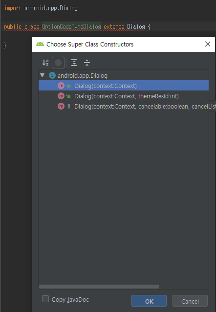 일단 custom 이라는 폴더 아래에 OptionCodeTypeDialog 라는 class 를 만듭니다.