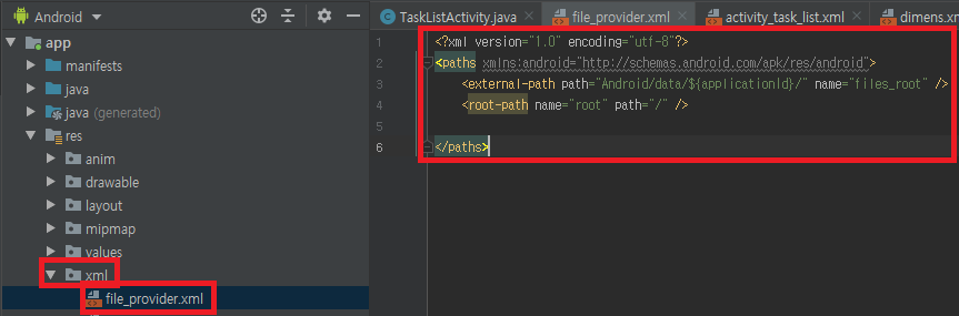 app > manifests > AndroidManifest.xml 에 <provider> 부분을 추가합니다.