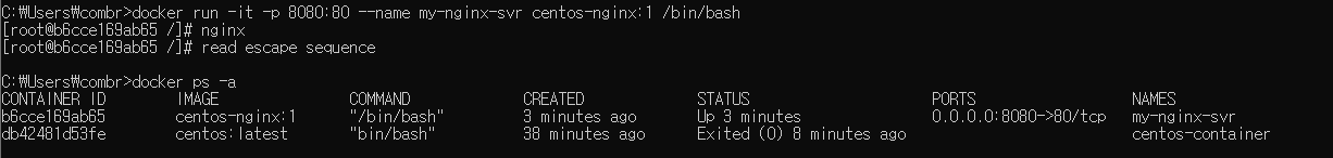 container 내부에서 nginx 를 입력하고 ctrl+p, ctrl+q 를 연속으로 눌러서 container 밖으로 나옵니다.