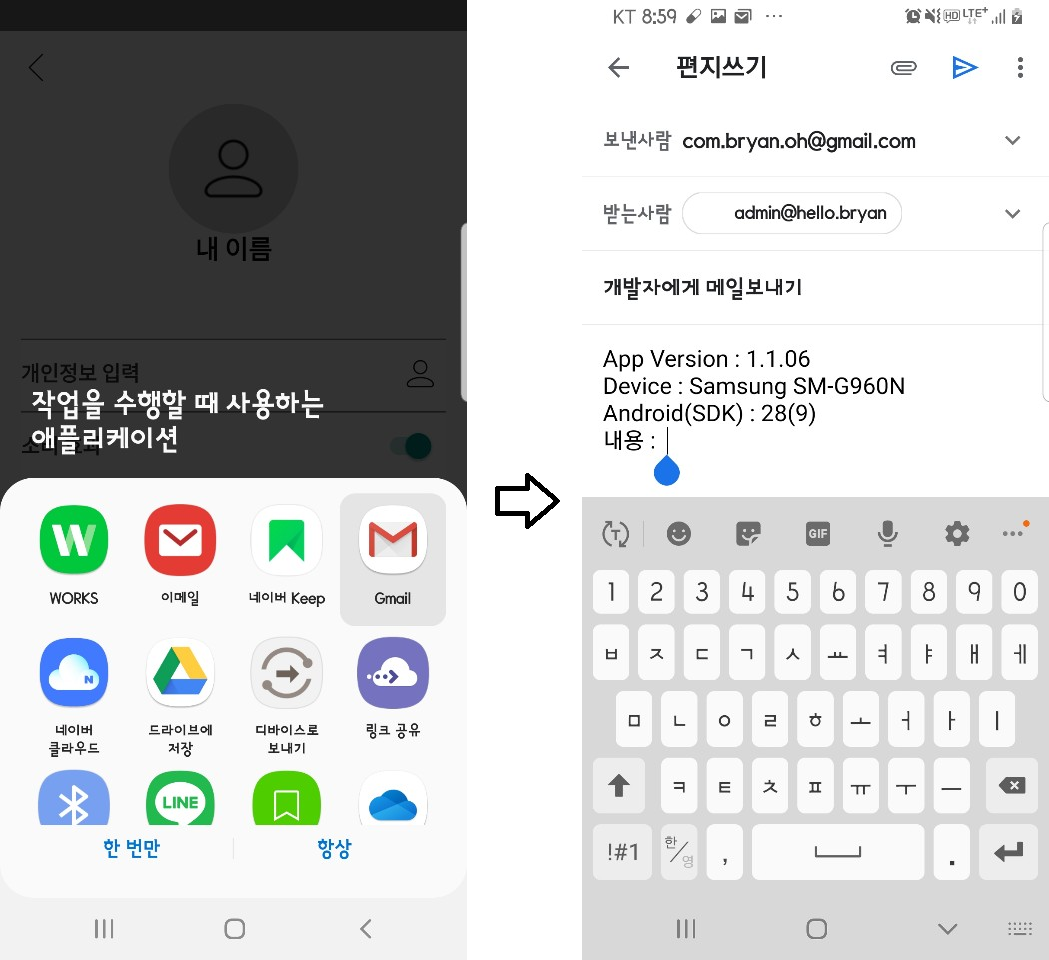 보내는 사람은 폰의 계정을 선택하거나 선택되어있습니다.