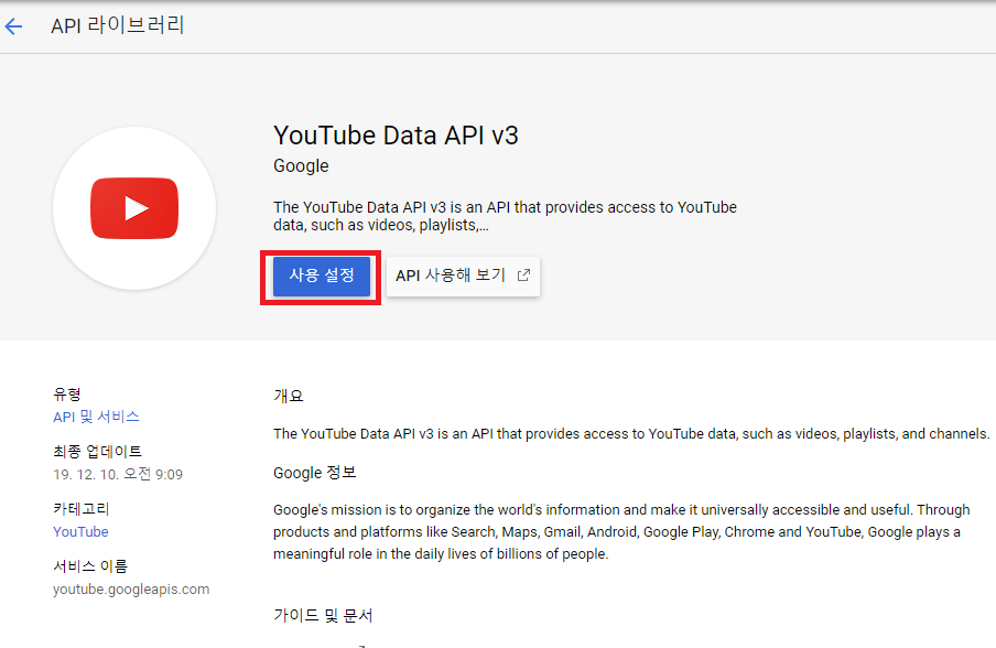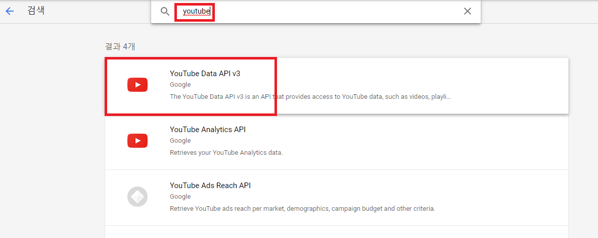 3. 라이브러리 에서 youtube data api v3 검색