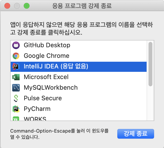 option + command + ESC 키를 같이 누르면 아래와 같은 이미지가 뜹니다.