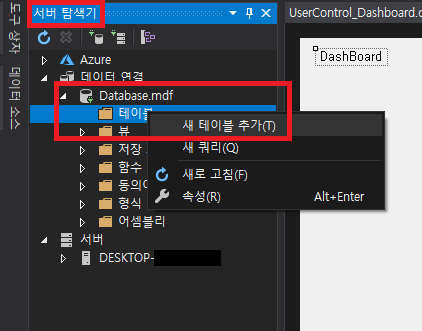 테이블을 생성하려면 서버 탐색기에서 추가된 DB 파일을 선택합니다.