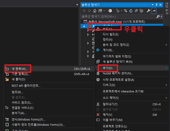 솔루션 탐색기에서 우클릭 > 추가 > 새 항목 클릭.