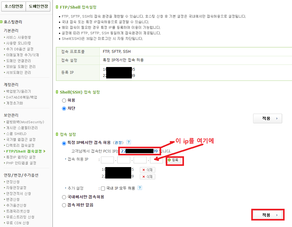 방화벽인가... 하면서 카페24 관리자 페이지를 뒤적거리는데,
