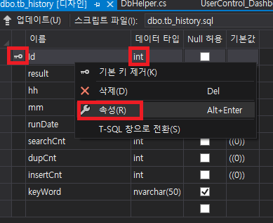 Key 값 선택 우클릭 속성 ( type이 int 이어야 합니다.)
