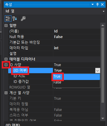 ID 사양을 펼치고 ID여부를 True 로 선택해 줍니다. (증가값등 설정 가능)