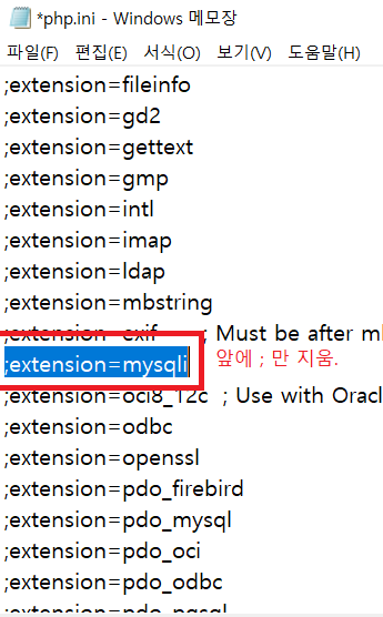 ;extension=mysqli 를 extension=mysqli 로 수정합니다.