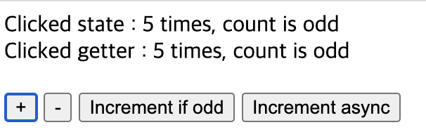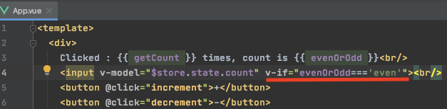Clicked: {{ $store.state.count }} times, count is {{ evenOrOdd }}<br/>