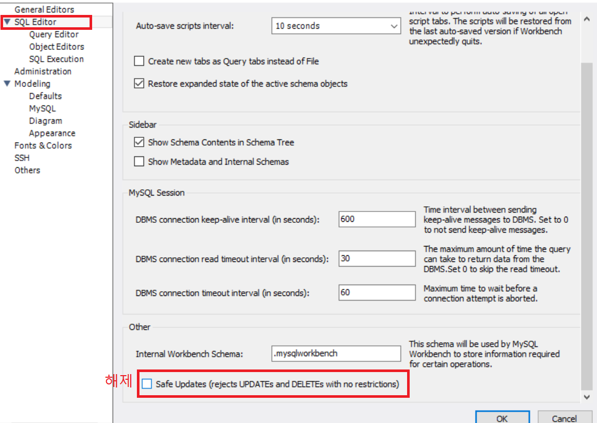 Safe Updates (rejects UPDATEs and DELETEs with no restrictions) 체크 해제