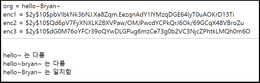 echo "<br/>$tmp 는 ".(password_verify($tmp, $enc3) ? "일치함" : "다름");