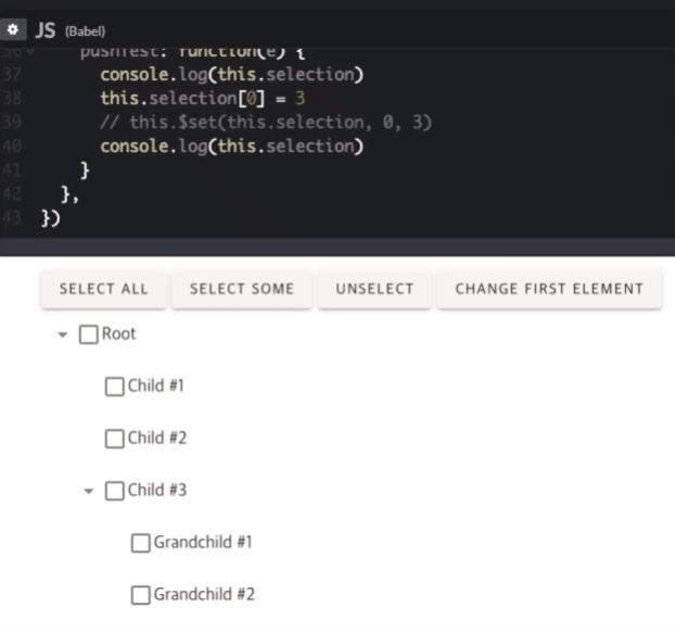위 코드는 this.selection 값 전체를 변경 하는 것인데요.