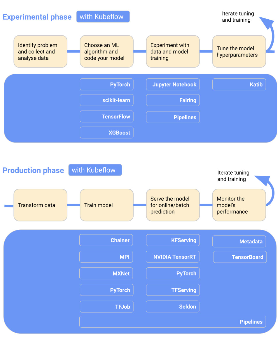 다음 다이어그램은 Kubeflow를 워크 플로에 추가하여 각 단계에서 유용한 Kubeflow 구성 요소를 보여줍니다.