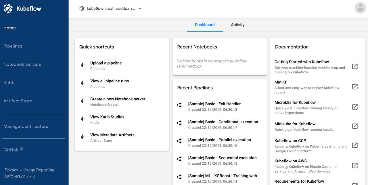Kubeflow UI는 다음과 같습니다.
