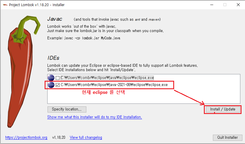 Project and External Dependencies 를 확장하고 lombok-{version}.jar 를 찾습니다.