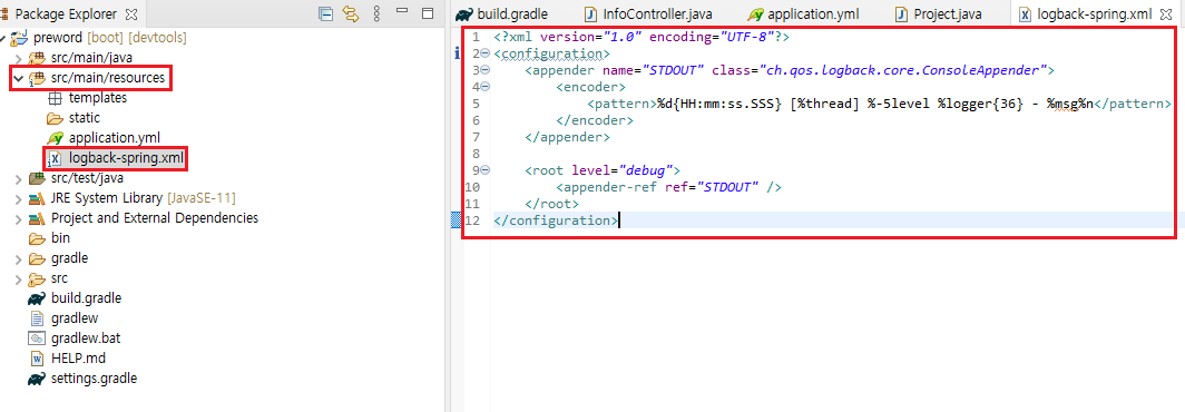 아래 경로에 logback-spring.xml 파일을 생성하고 다음과 같이 작성합니다.