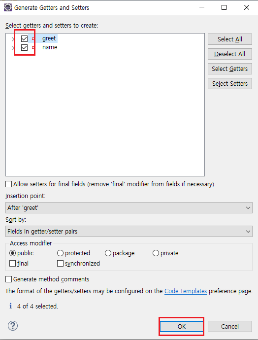 코드에서 우클릭 > Source > Generate Getters and Setters.. (또는 단축키 : Alt+Shift+S 누르고 r )