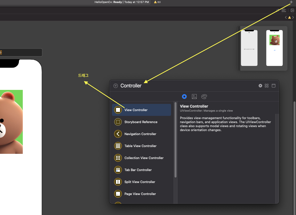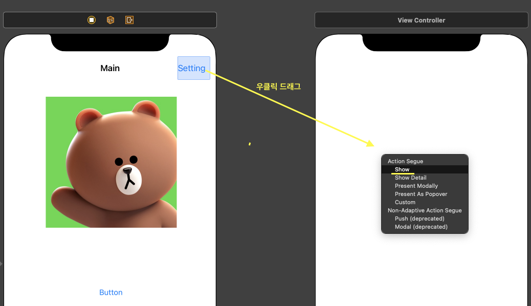그 버튼에서 마우스 우클릭으로 누른 상태로 우측 ViewController 로 드래그해서 드랍 하면 팝업 다이알로그가 뜹니다.
