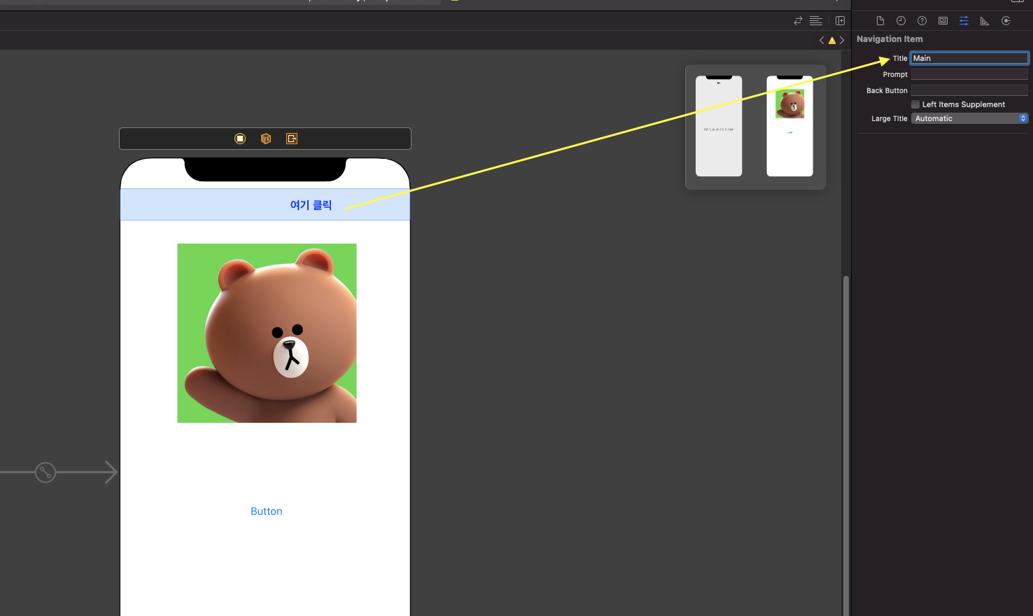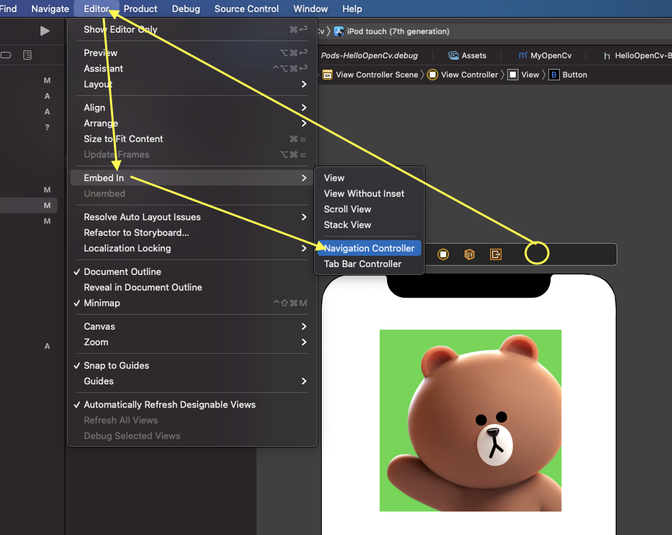 상단 메뉴의 Editor > Embed In > Navigation Controller