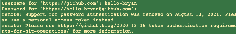 Support for password authentication was removed on August 13, 2021. Please use a personal access token instead