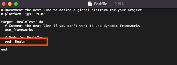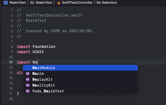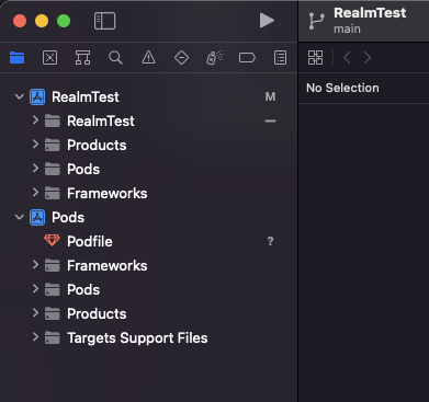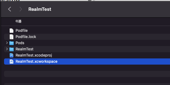 Xcode 에 현재 프로젝트가 열려있다면 닫은 다음 RealmTest.xcworkspace 를 더블클릭해서 실행합니다.