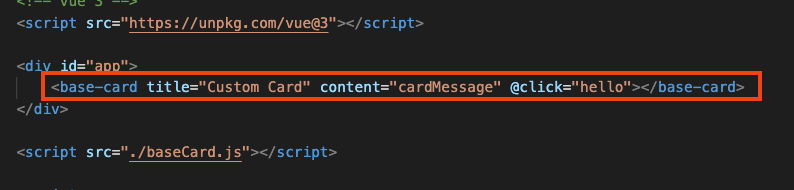 <base-card title="Custom Card" content="cardMessage" @click="hello"></base-card>