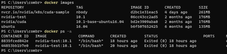 Windows Terminal (또는 Power Shell 또는 CMD ) 에서 Docker Images 와 Containers 를 검색해보면