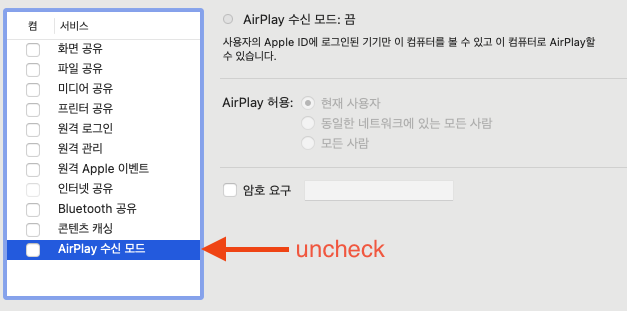 좌측에 "AirPlay 수신 모드" 에 체크 해제