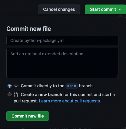 설정을 다 입력했으면 우측 상단에 Start commit 을 클릭하고 Commit new file 을 클릭합니다.