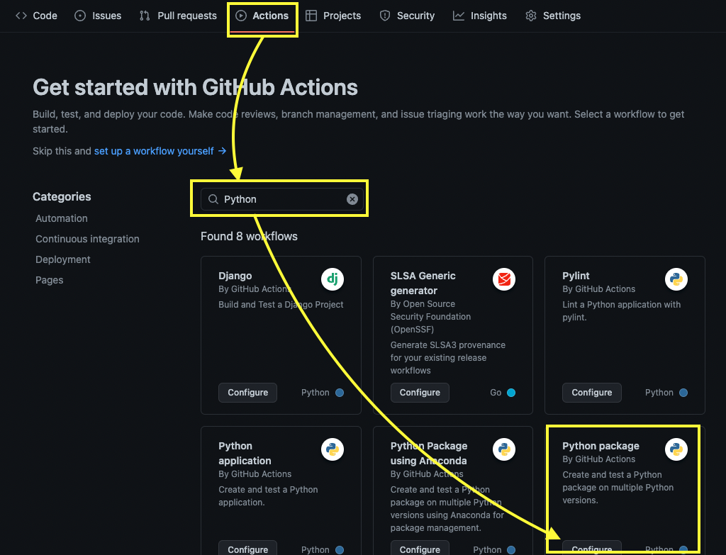 상단 메뉴에 Action -> 검색창에 "python" Enter -> Python package 의 Configure 클릭