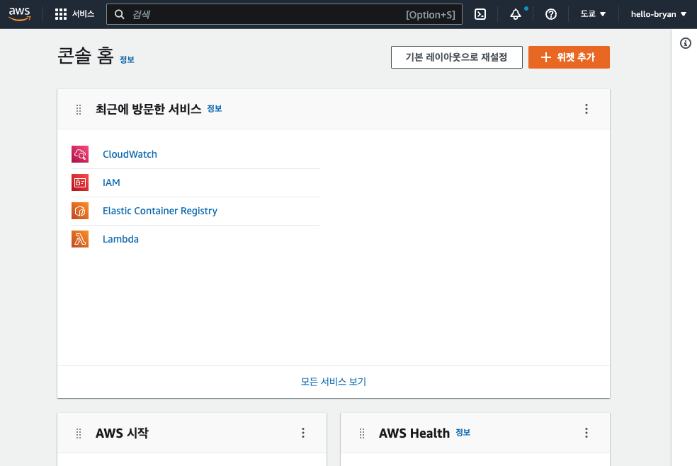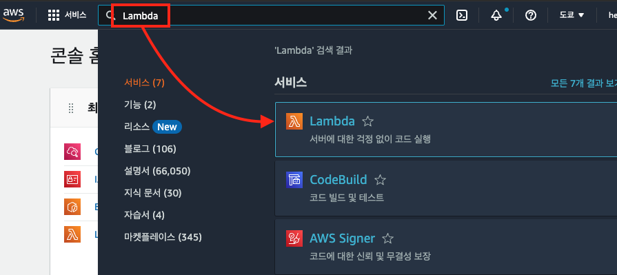 최근에 방문한 서비스에 Lambda 가 안보인다면, 상단에 "검색"란에 Lambda 를 입력합니다.