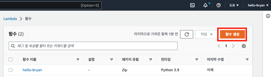 그리고 다시 AWS Lambda 에서 "함수생성" 을 클릭합니다.
