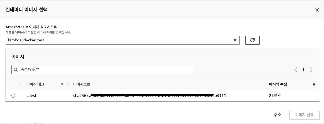 "이미지 찾아보기"를 누르면 ECR 이미지 리포지토리에서 이미지를 선택할 수 있게 표시가 됩니다.