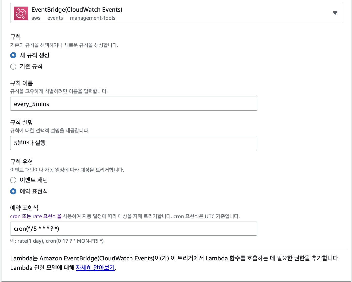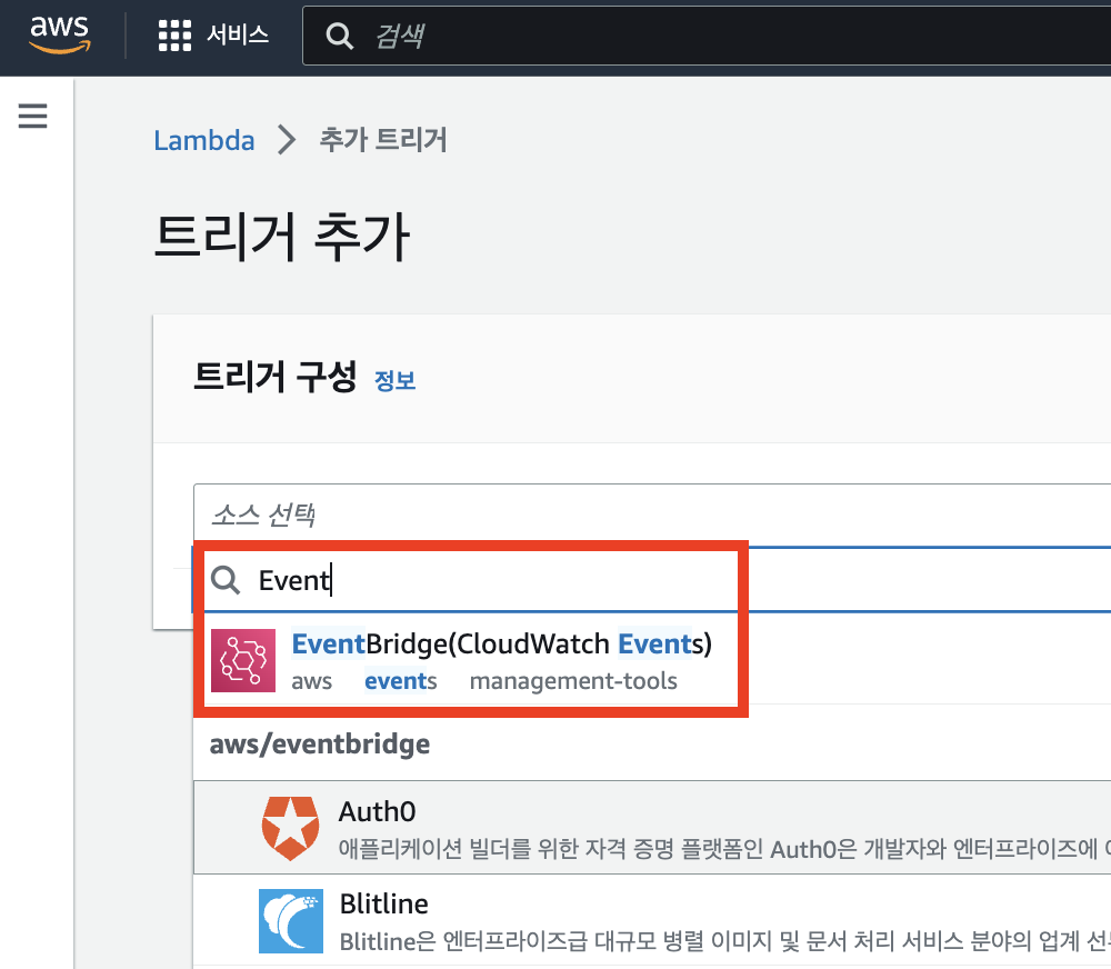 Lambda 함수에서 "트리거 추가" 후에 EventBridge 를 검색하여 선택합니다.