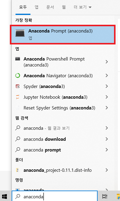 설치 완료 후 "윈도우 시작 -> anaconda" 입력하면 prompt 가 보입니다.