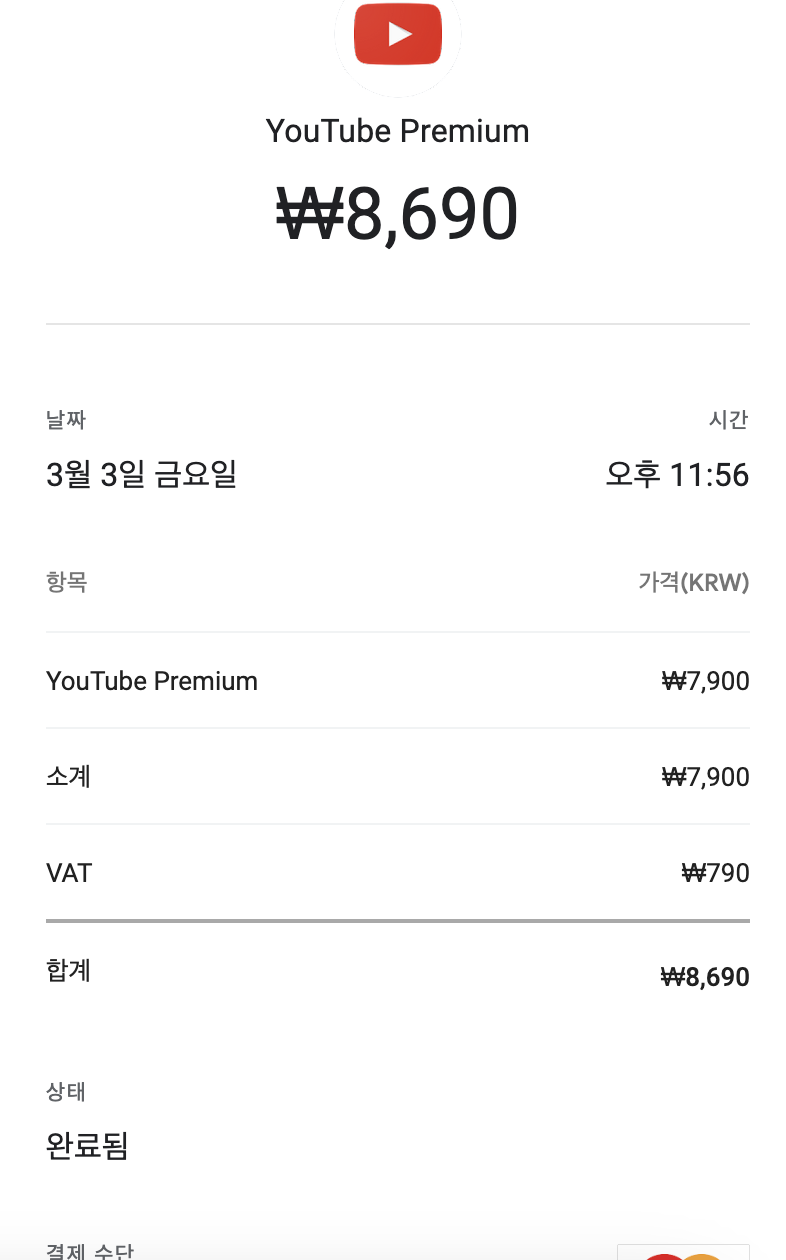 모바일로 유튜브에 가서 구매항목 및 멤버십으로 들어가도 영수증은 안보이고,