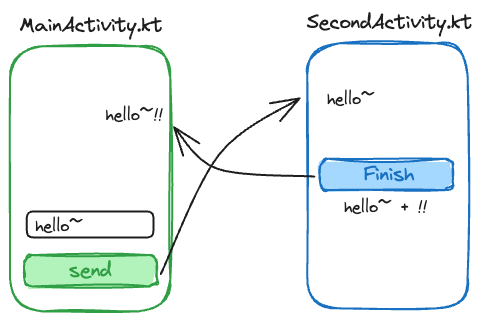 위의 startActivity(intent) 는 MainActivity 에서 SecondActivity 로 데이터를 넘길 수 있지만,