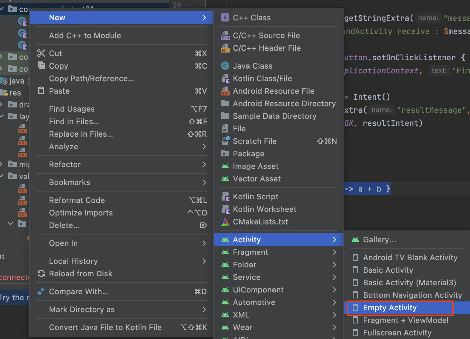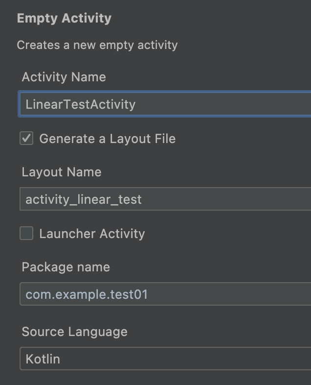 - empty activity를 하나 생성합니다. 이름은 LinearTestActivity