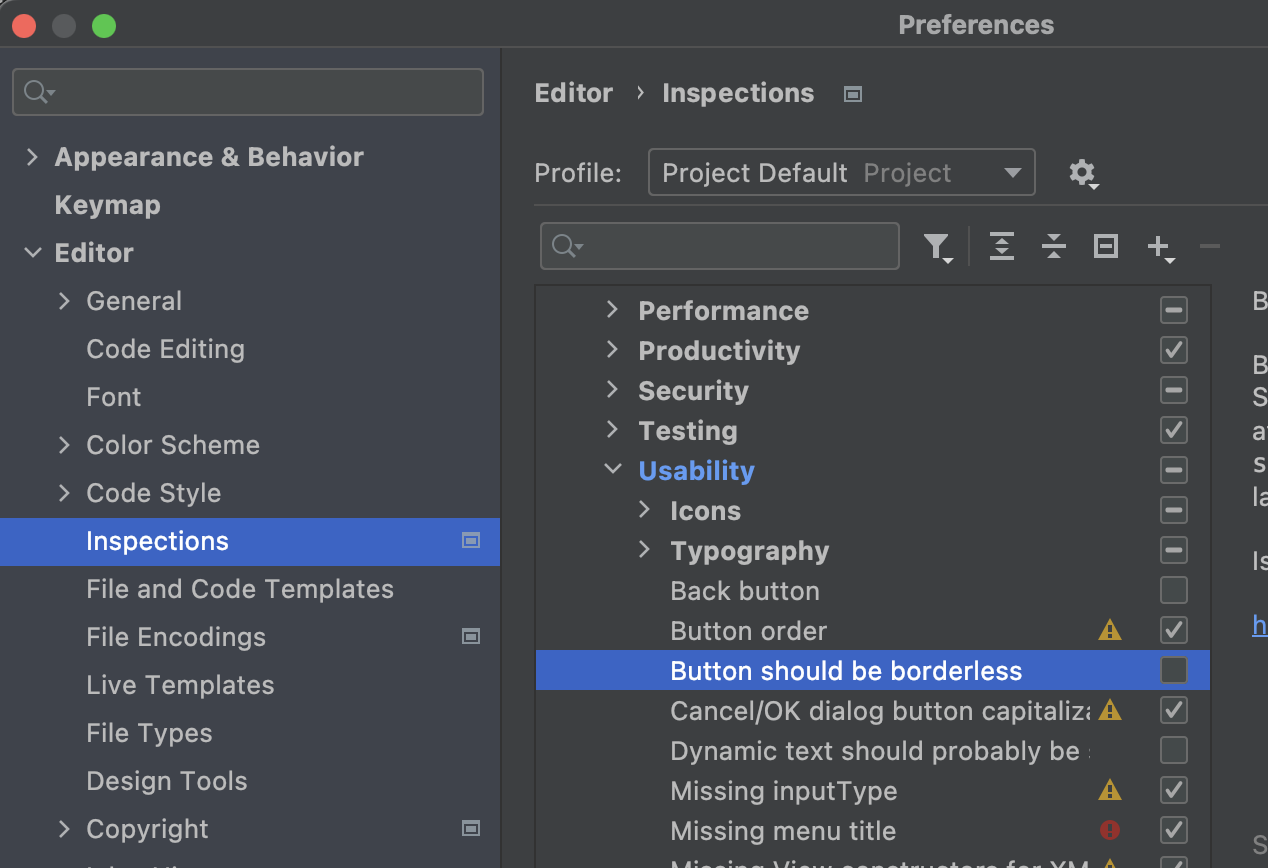 참고. 경고 메시지 "button should be borderless" File > Setting > Editor > Inspections 에서 Android > Lint > Usability > Button should be borderless 항목을 체크해제하면 경고 메시지가 사라집니다.
