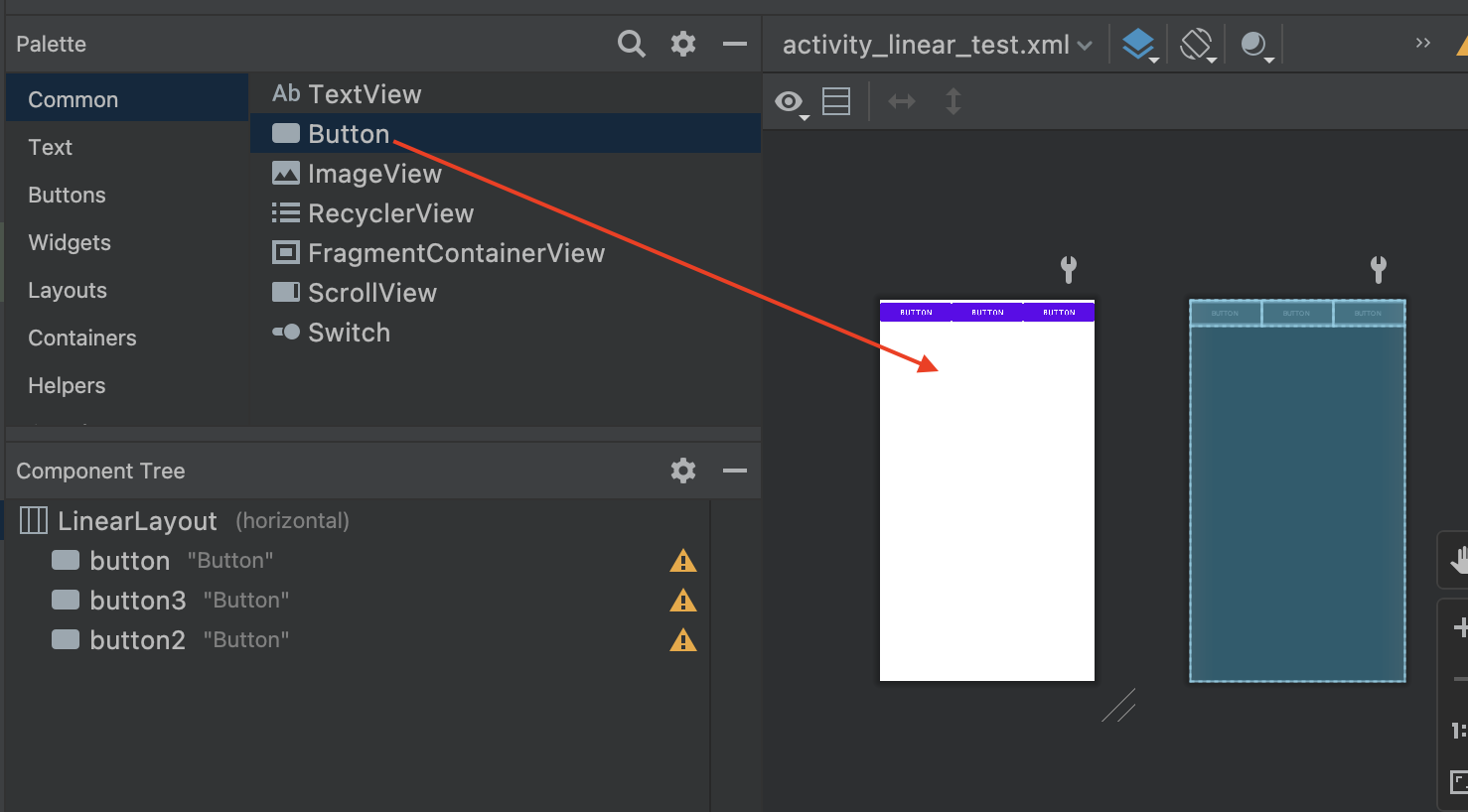 그리고 palette 에서 버튼을 세번 드래그 드랍합니다.