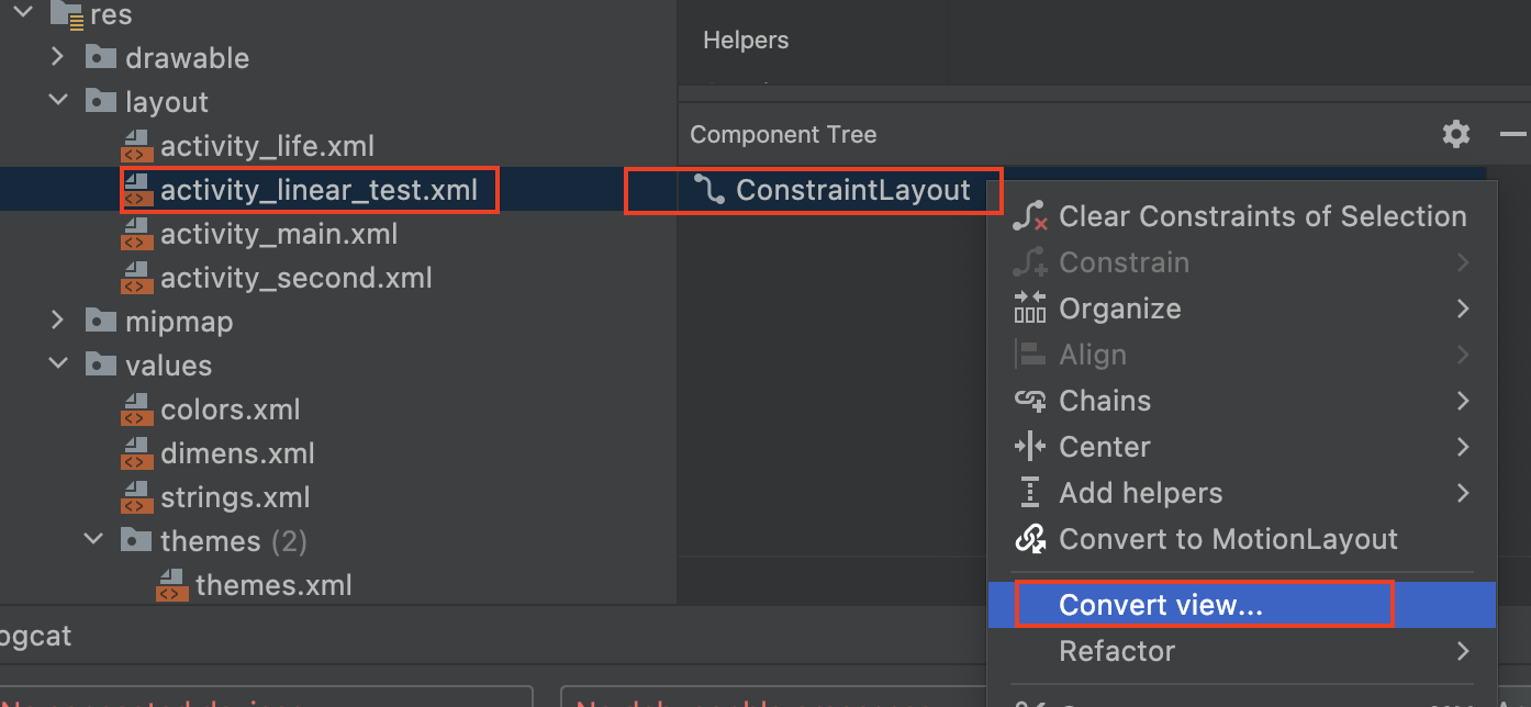 res/layout/activity_linear_test.xml > Component Tree > ConstraintLayout > Convert view... 클릭