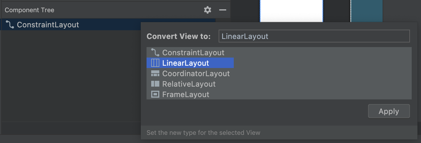 아래와 같은 팝업창이 뜬다면 LinearLayout 을 선택하고 Apply