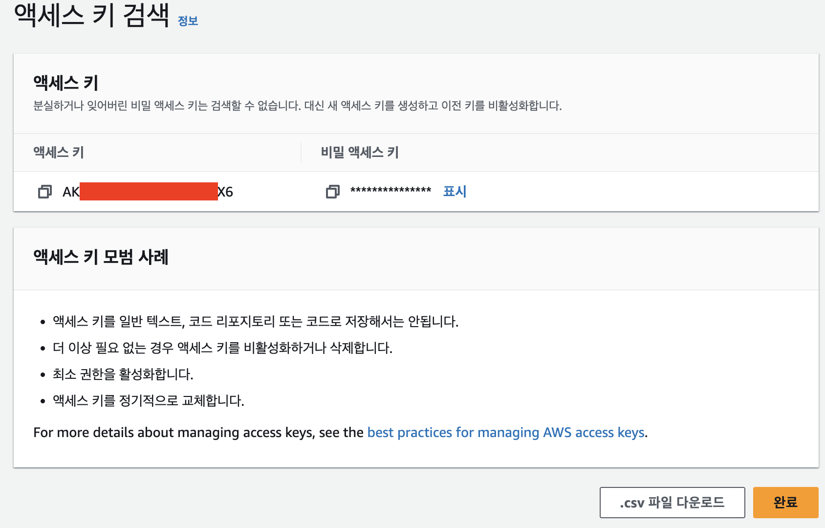 액세스 키가 생성되면 복사해서 잘 보관해야합니다. 또는 csv 다운로드해서 보관.