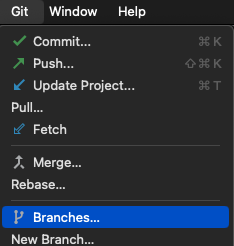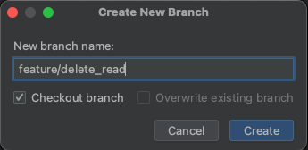 이제 새로운 브랜치를 만들어야 합니다. 다시 브랜치 창을 열고 (VCS -> Git -> Branches), New Branch를 클릭합니다. 브랜치 이름을 feature/some_name로 지정하고 Create를 클릭합니다.