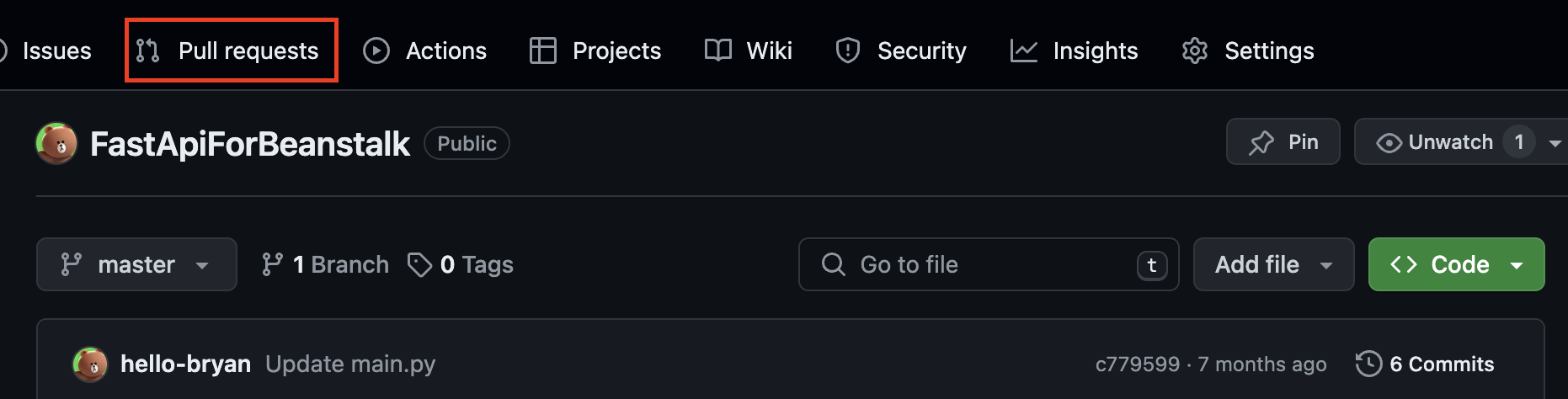 이제 GitHub 또는 사용 중인 Git 플랫폼의 웹사이트로 이동합니다. 저장소로 이동하여, 최근 푸시한 feature/some_name 브랜치를 선택합니다. 그런 다음, New Pull Request 또는 Create Pull Request 버튼을 클릭합니다.