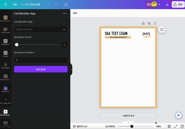 클라우드 DB에 있는 시험 문제 데이터를 가져와서 템플릿에 텍스트로 추가하는 기능의 앱 입니다.
