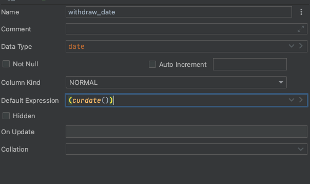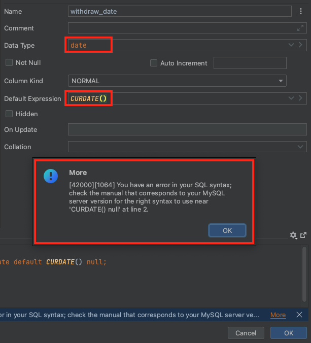 Default Expression 에 CURDATE() 를 입력하면 오류가 발생합니다.