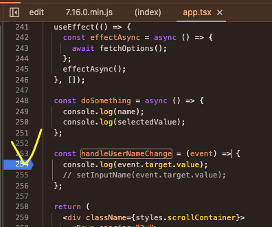 거기에서, 디버깅 하려는 메소드인 "handleUserNameChange" 를 검색.