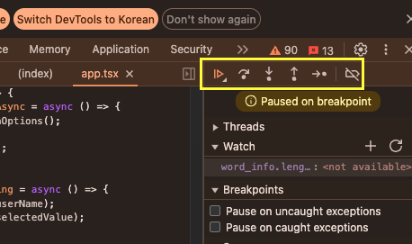 참고) 현재 breakpoint 가 걸려있는 상태라서, 다시 앱을 실행하려면